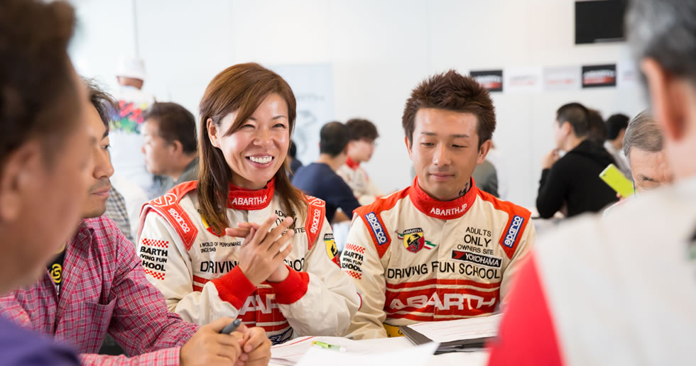 「はい。BASEクラス(初心者クラス)は、そういう人のためのものでもあるんです。最近、女性の参加者も少しずつ増えてきてるんですよ。奥さんと旦那さんのふたりでABARTHに乗っていらして、今日は奥さんが参加する日、次は旦那さんが参加する日、っていう御夫婦もいらっしゃいます。サーキットを走って得られることって、街中の運転にも役立つんですよね。例えばフルブレーキングなんて普通なら余程のことでもないと体験しないものだけど、サーキットでは安全に試せます。それがどれだけ危険回避に役立つことか。気持ちにも走り方にも余裕が生まれます。でも、何よりサーキットならABARTHの楽しさをもっともっと深く知ることができるし、新しい貌を見ることもできます。ABARTHのような素晴らしく楽しいクルマを所有するのなら、絶対に体験しないと損です(笑) スポーティな走らせ方をサラリとこなせる女性が、もっともっと増えたらいいのになって思いますね。」