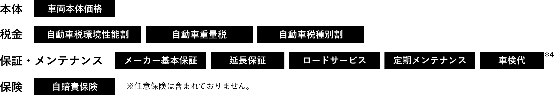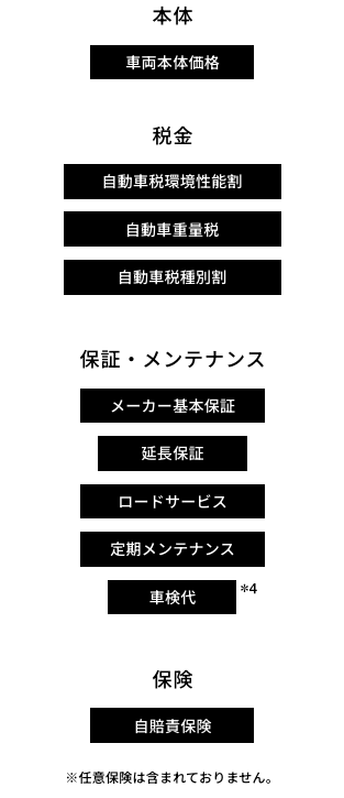 車両代、税金、自賠責保険料、登録諸費用、メンテナンスプログラム費用、車検費用、延長保証費用などはリース料金に含まれます。