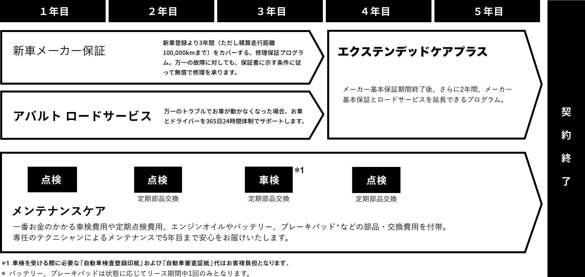 初回車検費用一式、法定12ヶ月点検費用(1年ごと:1年目、2年目、4年目)、部品交換(ブレーキフルード、ポーレンフィルター、ワイパー(左右セット・リア)、ウォッシャー液補充、補機用バッテリー*1 、ブレーキパッド *1 の交換費用)が含まれます。