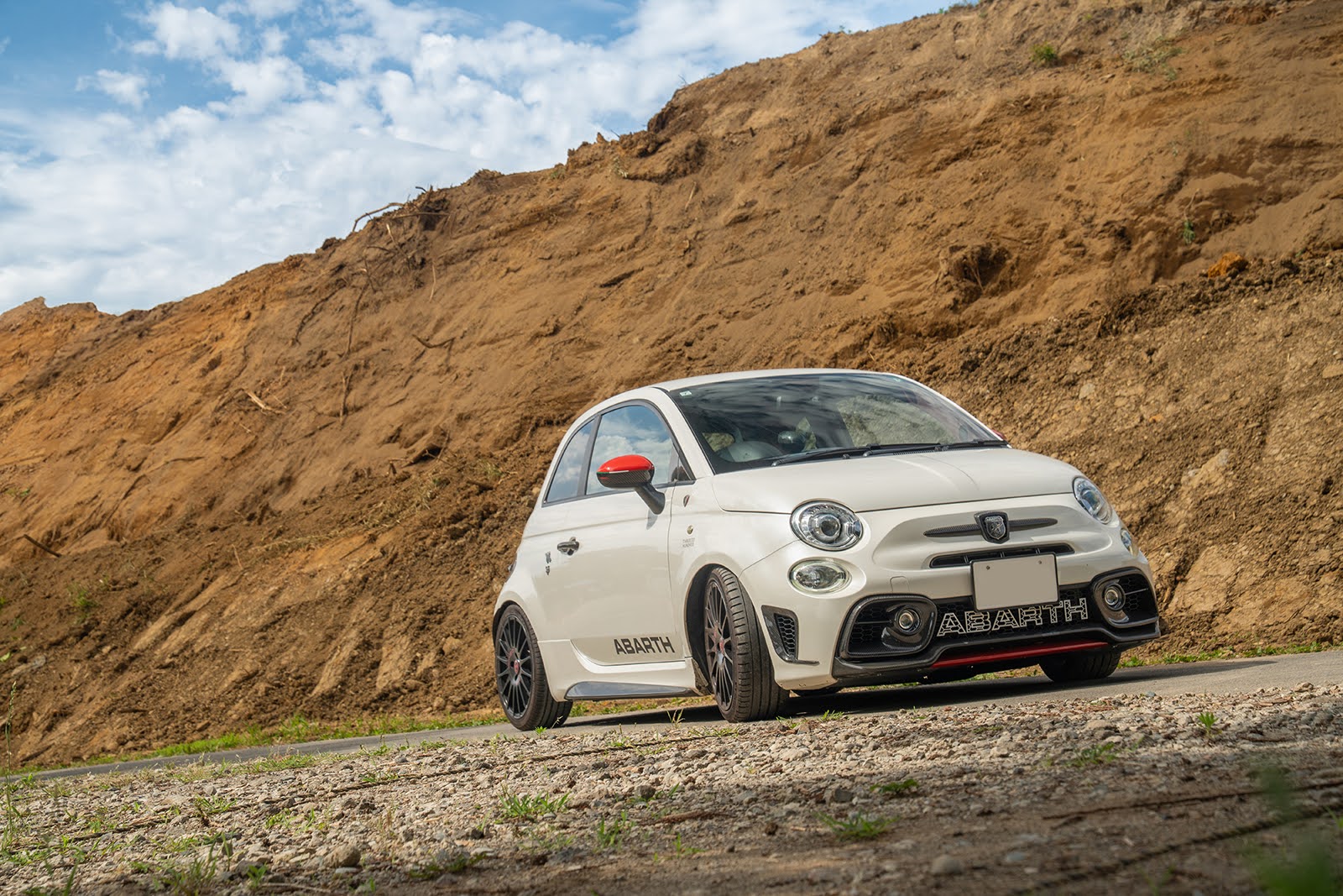 それでは実際に根岸さんが撮影された写真を見ていこう。まずはアバルトカレンダー 2026の選考でグランプリを獲得した1月の写真について聞いてみた。土壁の前に佇むこの写真は、クルマの角度が絶妙にカッコよく、空、壁、地面からなる背景も計算されている印象だ。根岸さんはどのような意図でこの写真を撮影したのか――。