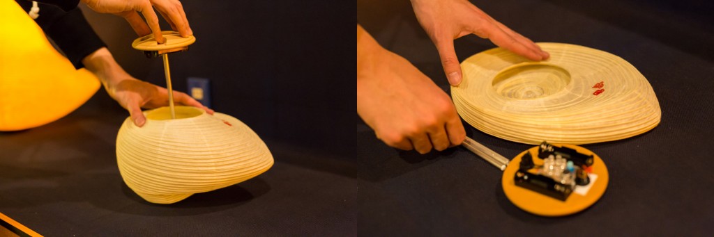 中には支柱を持たず、ぐにゃりと曲げて使用できるユニークな提灯「ICHI-GO」も。壁面につけて一風変わったインテリアとして使うことも可能だ。これはミック・イタヤ氏が提案したもので、基本的に「吊る」「立てる」ことを目的に設計する提灯職人の視点からは考えつかなかったものだそうだ。