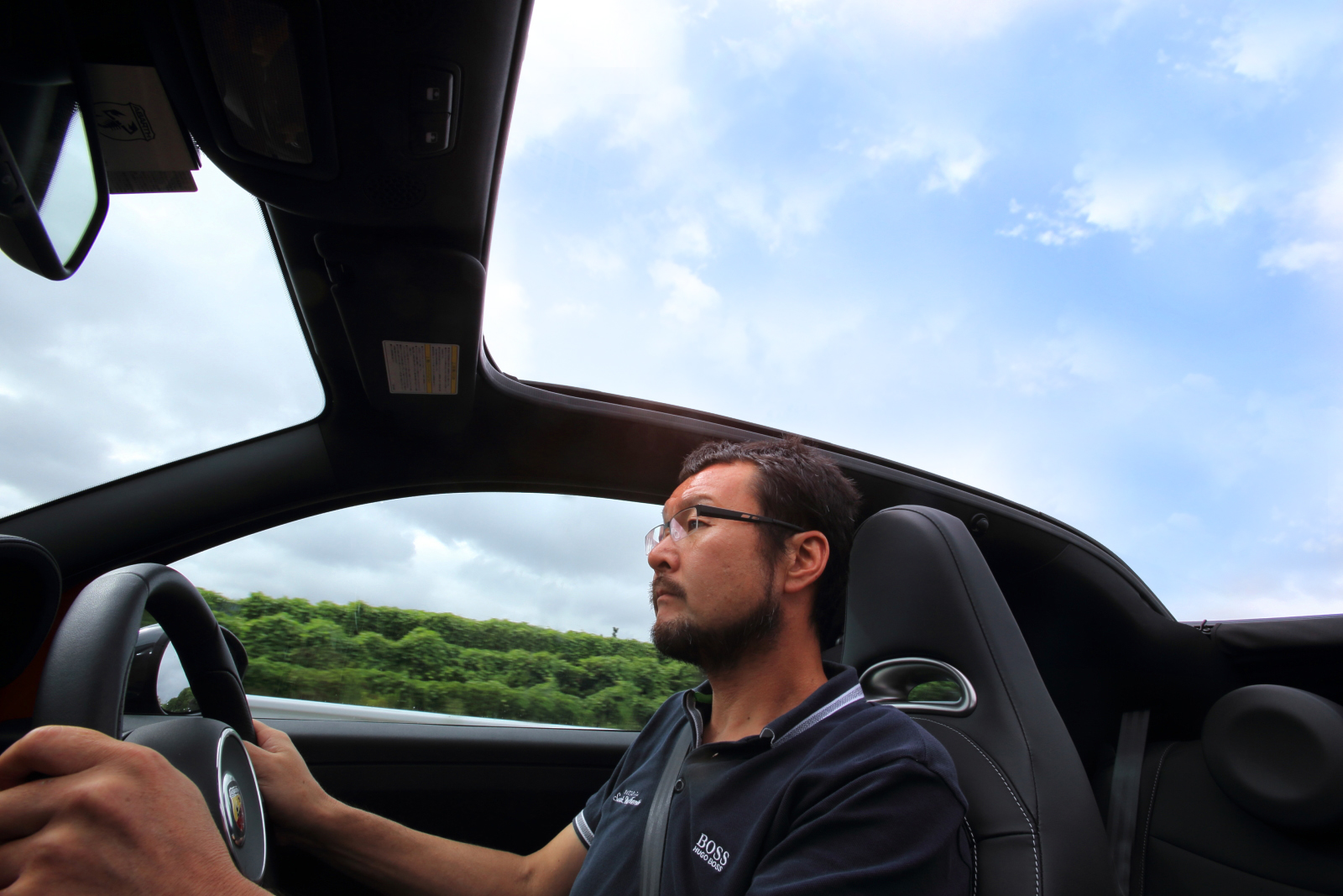 せっかくのオープンモデルということで、都内をスタートする瞬間から屋根を開ける。『595C ツーリズモ』の幌はスイッチ操作で開け閉めする電動タイプだから、操作は簡単。あっという間に青空が手に入った。