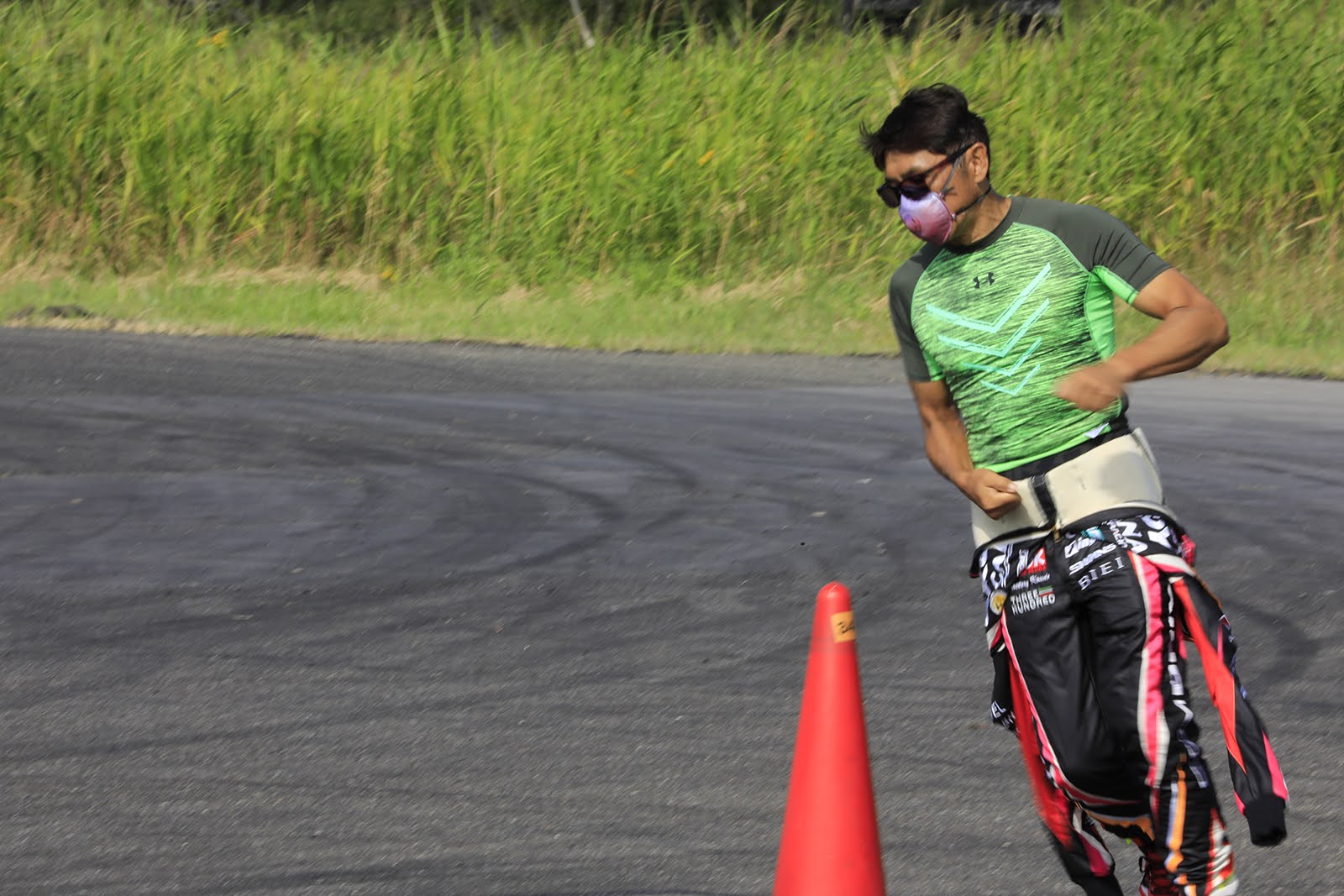 快晴のなか行われた決勝。完熟歩行で走行ラインを頭にイメージしながら、少しでもクルマの速度に近づけようとランニングでパイロンを回る山野選手。そのスタイルは夏でも変わらない。