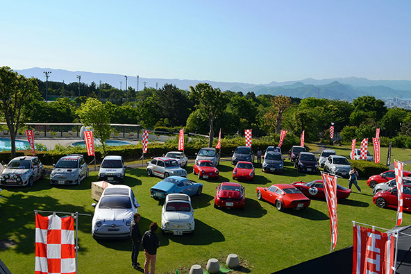 今回のアバルト デイズもこれまでの通例に従って、初日は箱根・伊豆周辺のワインディングロードを堪能するタイム&クイズラリーとウェルカムパーティ。そして二日目は毎年イベントの拠点としてご提供いただいている“ニューウェルサンピア沼津”芝生広場を会場に、美しいクルマたちと愛車談義によるミーティングが開催されることになった。