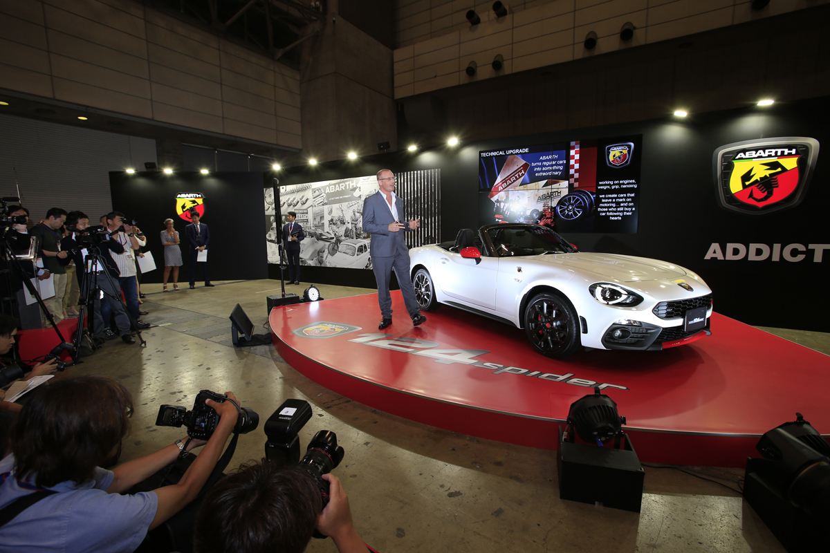 8月5日午前10時、プレスカンファレンス開始の時間になると、『アバルト 124 スパイダー』のデビューの瞬間をひと目見ようと、ブースには大勢の報道陣がつめかけた。数々の栄冠をもたらした『アバルト 124 スパイダー ラリー』へのオマージュとして、マツダ ロードスターをベースにアバルトが開発したニューモデルが、いよいよ発表される。