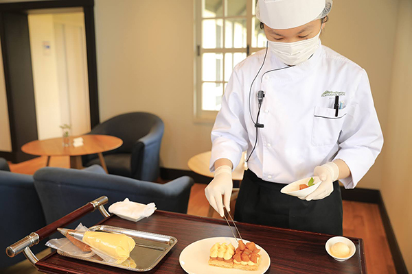 カフェテリアでは、パスタやスイーツ、淹れたてのコーヒーなどをいただくことができます。素材や調理方法にこだわっているだけあり、とても美味しく、心地よいひと時を過ごせること間違いなし。六甲アップルパイは旧六甲山ホテルの名物だったものを現代風にアレンジしたメニューで、朝焼き上げるパイ生地をベースにパテシエがテーブルの前で盛り付けてくれます。