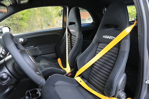 595 Momentoのインテリア。カーボンのダッシュボードパネルはスパルタンな雰囲気を高める。専用のファブリック地が採用されたSabelt製スポーツシートにはイエローのシートベルトが組み合わされる。